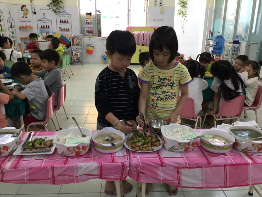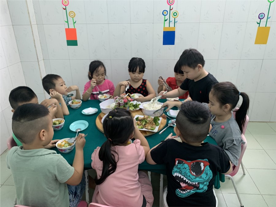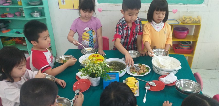 Nhằm giúp trẻ vui vẻ, phấn khởi khi bước vào giờ ăn, hình thành cho trẻ thói quen tự phục vụ và rèn kỹ năng sử dụng nhiều loại đồ dùng trong ăn uống. Khâu chăm sóc nuôi dưỡng nhà trường luôn thay đổi nhiều hình thức tổ chức bữa ăn để trẻ hứng thú, giúp trẻ ăn hết suất. Sau đây là một số hình ảnh: